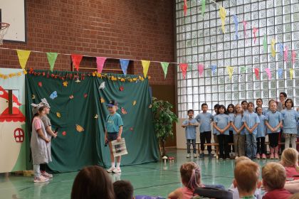 Anschließend führten die Kinder der Theater-AG und des Schulchores das Stück "Nils lernt lesen" auf, dass unsere Erstklässler gespannt verfolgten: Nils ist ein Schulanfänger, der lieber im Wald spielt, als zur Schule zu gehen. Er begegnet Tieren und Menschen und lernt, dass es sehr gut ist, wenn man Lesen kann. Unsere Schüler/innen gaben zum Schluss den Erstklässlern Wünsche für die Schulzeit mit auf den Weg.